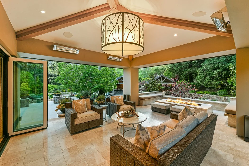 Designed by architect Alan Page and re-built in 2017 by local luxury builder, McKenzie Gray, the refined, transitional design is reflected in every detail from the unique textured wallpapers to the beautiful custom cabinetry and high-end finishes. The living room has a wall of folding glass doors that open completely to a covered loggia with overhead heating and a large fire pit allowing for year-round indoor/outdoor enjoyment. Step out onto one of the patios to experience a morning coffee, lounge poolside, or just enjoy nature while dining al fresco beside a soothing water feature.